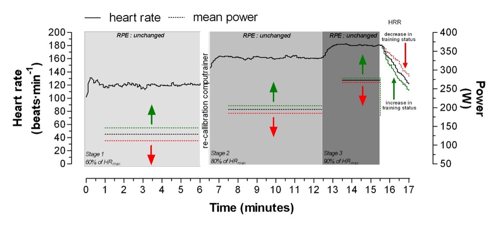The maximal heart rate and submaximal heart rate at high intensities remains relatively unchanged in professional cyclists throughout the season (Lucia et al. 2000), providing they do not become fatigued or over-trained. Based on the knowledge that peak power and submaximal power improves with an improvement in training status, and decreases with a decrease in training status (Brooks et al. 2005; Jeukendrup 2002), we expect that these changes also can be seen within the LSCT. Support for this hypothesis was found in Chapter 7, in which a cyclo-cross cyclist showed a similar improvement in PPO (24 W) and power output at 90% of HRmax (27 W) within the LSCT (Lamberts et al. 2009a). Additional support for this hypothesis was found in Chapter 6, in which a good correlation (r= 0.94) was found between PPO and power output at 90% of HRmax (Lamberts et al. 2009b). However, as Chapter 6 did not study whether a change in PPO is reflected in a change power output at 90% of HRmax and Chapter 7 describes a case study, future research needs to confirm this hypothesis. Hypothetically, assuming that submaximal power output changes with a change in training status, we expect this is reflected in the LSCT as follows (see also Figure 1):